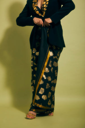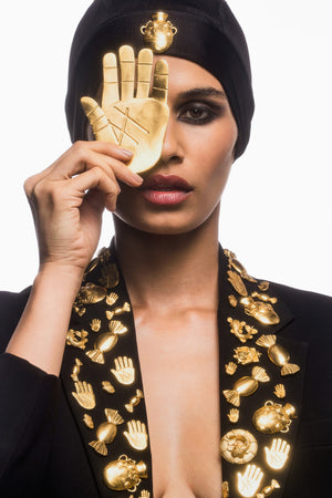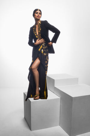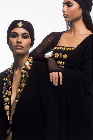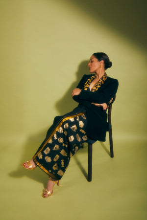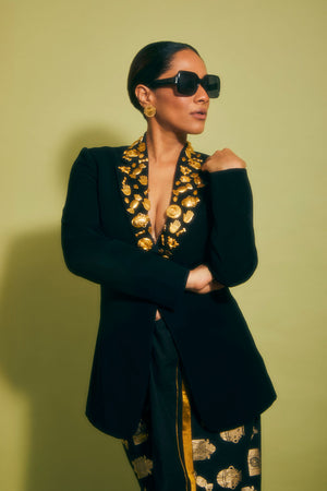Details: Single breasted blazer in black heavy crepe adorned with iconic House of Masaba gold plated mascots on the collar.