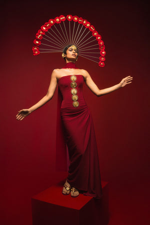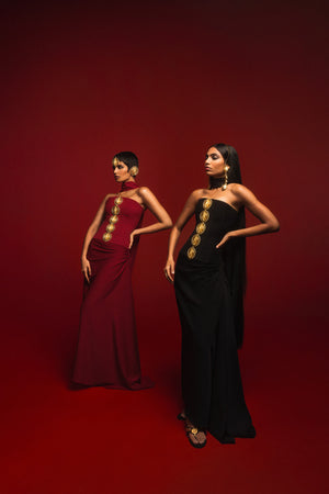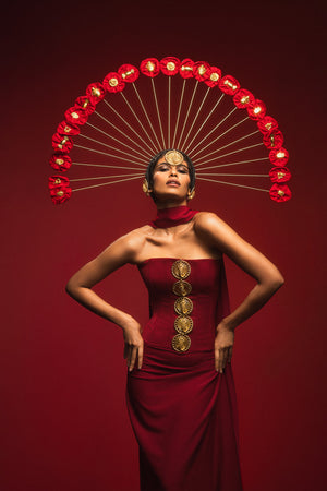 Details: The Ghana Gator Corset with the Drape skirt is a striking yet elegant ensemble adorned with our gold ghana gator mascots. The beautiful flowy sash paired with this set enhances the look of the outfit.