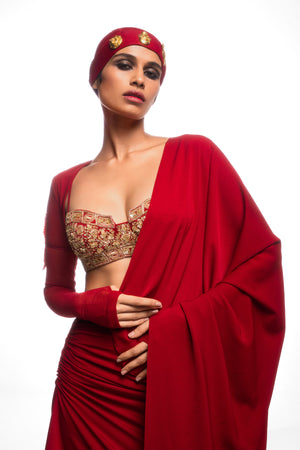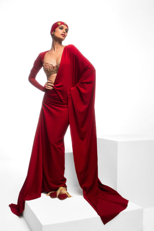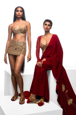 Details: This draped saree is unique in its drape as well as its look. with ruching and a trail on the side and a long pallu with our signature motif embroidered across. The bustier is embroidered with our house mascot and a dense foliage pattern and paired with a mesh bolero that has thumbholes to add that extra 'oompf'.