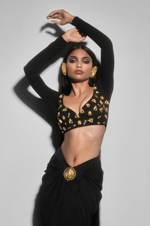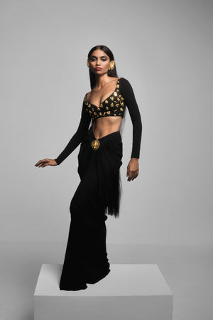 Details: Aptly named The Siren, this black heavily charmed set exudes sultry energy from every pore. The blouse contains a scatter mix of our Akan Ghana mask and Matsya Charm with a deep sweetheart neck that makes it a flattering cut for all. Completed with a low waist sheer slinky drape skirt with a bold Ghana Gator charm on the belt.