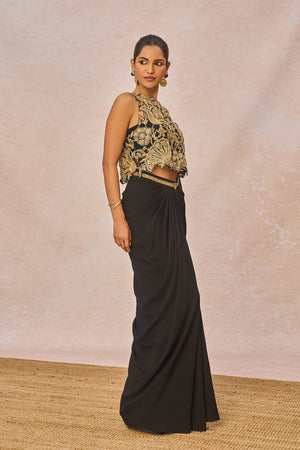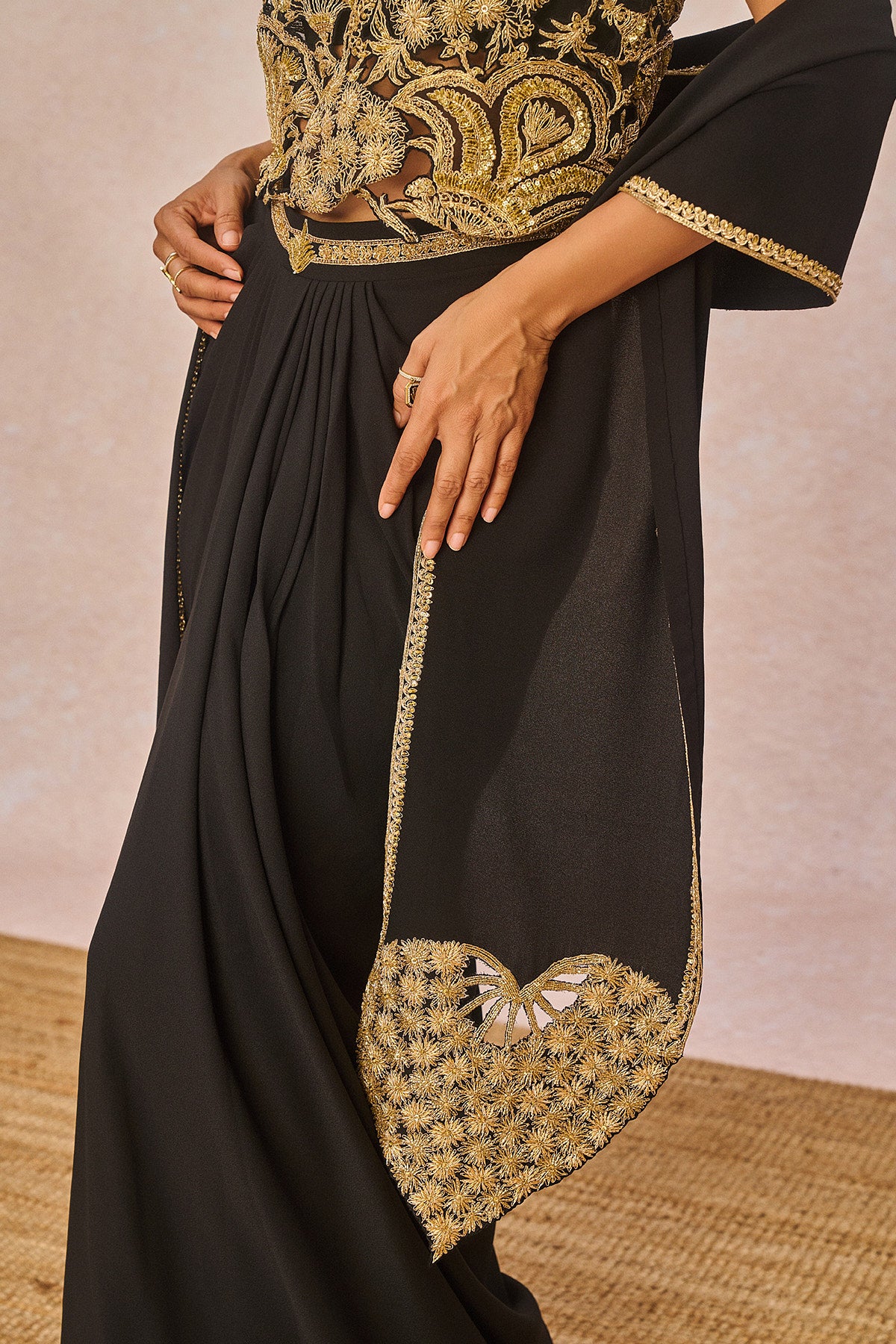 Description: ‘AJNABI EHSAAS’ fusion set is a striking four-piece set is a celebration of craft and detail. The ensemble features a tulle cutwork top adorned with our signature Paankh Bagh motifs creating a jaal and a delicate back closure. It is paired with a front-pleated draped skirt, elevated by an embroidered waistband, back opening, and a thoughtfully placed printed lining. The look is completed with a tube-style bustier featuring a printed facing, and a matching stole with cutwork Paan Phool motifs at both ends, finished with a printed edge. A perfect blend of modern silhouette and intricate craftsmanship.