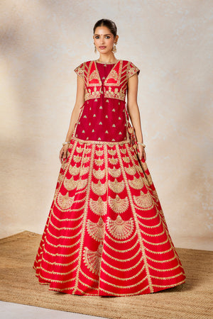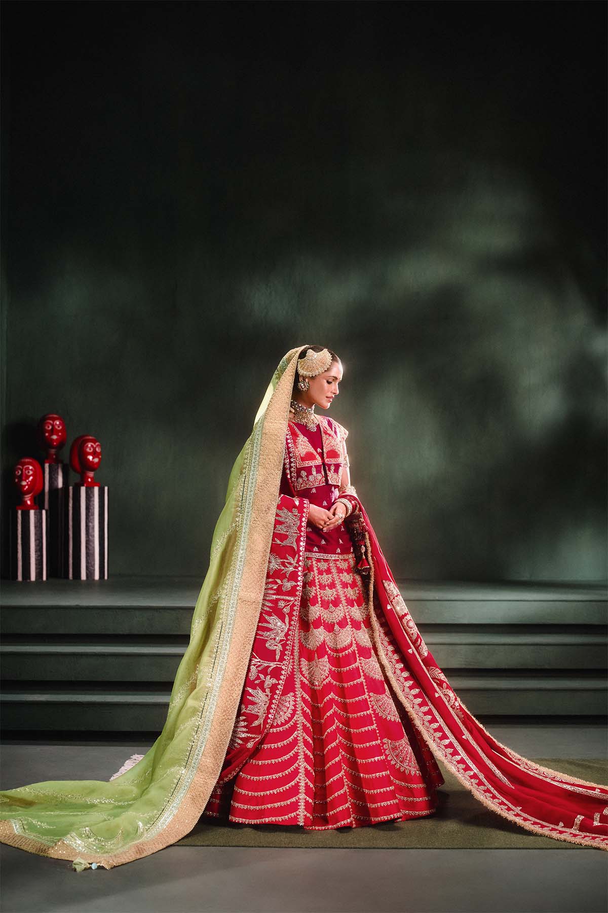Description:Drawing inspiration from the traditional Daaman, Kurti and Chunder of Haryana and giving it a contemporary narrative, The Anar Dana lehenga defines tradition and heritage. With 6 elements in this Lehenga- the Silk Kurta with an ornate koti embroidered with our Kunji motif, the cascading Raj Pankh motif embroidered throughout the lehenga styled with an additional saree and a contrast patchwork dupatta- This is the purani dilli Masaba Bride. Comes with a separate cancan.