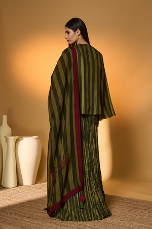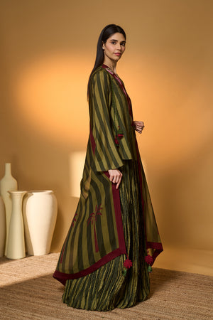 Details: Kurta Top- V-neck | Flared Body | Yoke embroidered in contrast colors | Adorned with tassel details | Bell Sleeves Skirt- Kali Skirt | Crushed Body | Side seam zipper closure | Flared Silhouette Dupatta- Sheer | Adorned with tassels | Contrast 'Tree' placement on either side