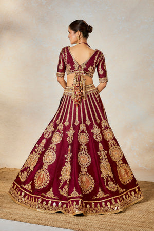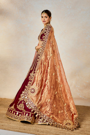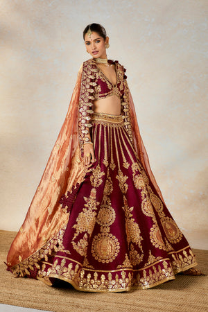 Description: The Anjeer Kalakand lehenga is an elegant bridal ensemble, featuring delicate circular tissue patches that add a refined, textured element to the lehenga. The standout detail is the intricate Baug Taj motif, a traditional floral design that exudes luxury and sophistication, embroidered with fine threads and beads to create a rich, detailed effect. The lehenga is paired with a beautifully crafted blouse that showcases scalloped sleeves, enhancing the overall elegance and giving the outfit a contemporary touch. A tissue dupatta, with delicate appliqué lace along the edges, adds further richness and completes the ensemble with its soft, ethereal feel.