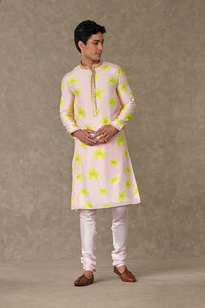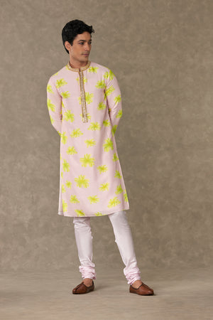 Details: Baby Pink Parijat Kurta Set - All over digital printed kurta| Full sleeves embellished with border| Concealed placket and Mandarin collar embellished with border | Pocket detail Churidar- Churidar with tie up | Hook and eye closure at the ankle