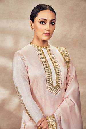 Details: Kurta - Beautiful foil printed kurta | Mandarin collar | Front Placket opening | Full sleeves | Embellished with embroidered borders Sharara- Semi-Fitted Sharara embellished with embroidered borders | Side seam opening Dupatta- Printed organza dupatta | Embellished with embroidered border and edged with kinari