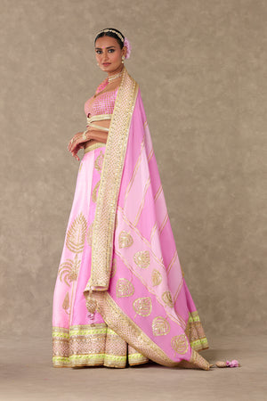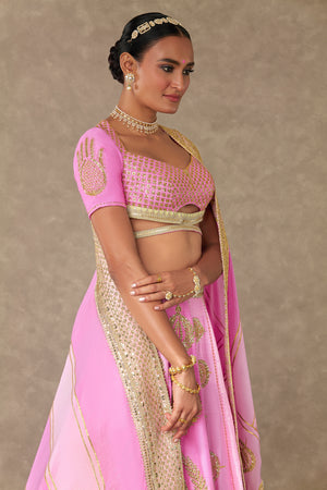 Details: Barfi Pink lehenga- Lehenga comes in not one but 3 different shades of pink- Mithai Pink, Rani Pink, Gulaab Pink and is embellished with our signature Sitara- Dil motif with dori & sitara kaams | Hemline is embellished with beautiful patchwork borders and edged with jhallar | Side zip closure | Pocket detail | Comes with a separate can can skirt Blouse- Cut-out blouse adorned with Jhaali in dori and sitara kaam |Cap sleeves adorned with Haath-Phool motif in dori and sitara kaam| Sweetheart neckline | | Centre back closure Dupatta- Beautiful pink patchwork dupatta adorned with gota sila & sitara dil motif in dori and sitara kaam | Embellished with embroidered border and edged with jhallar | Tassel detail