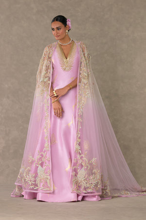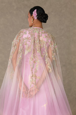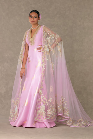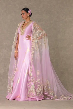 Details: Light Pink Wedding Gown - Gown- All over foil printed Gown | 'V' neckline adorned with Trikone in dori and sitara kaam | Sleeveless| Center Back closure Trail- Beautiful ombre dyed trail | Adorened with jhaal embroidery in dori, sitara, moti, baadla and coloured thread kaam | Edged with jhallar