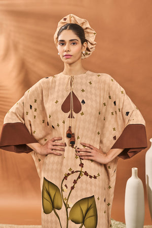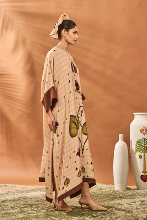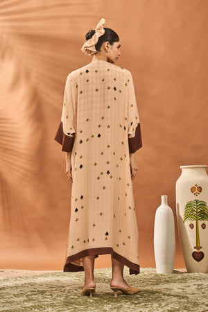 Details: Kaftan- Beige clover checks kaftan adorned with patchwork on sleeve | Asymmetrical hemline | Tie-up detailing