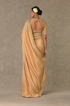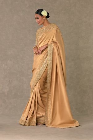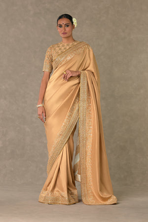 Details: Beige Silk Saree - Adorned with signature Madakal-Chidiya border in pita, dori, sitara & dabka kaam Embroidered stitched blouse - Embroidered intricately in signature jaal with chidiya motif in pita, dori, sitara and dabka kaam | Centre back opening. Dupatta - All over digital printed dupatta in signature Masakali print | Embellished with borders and edged with kinari