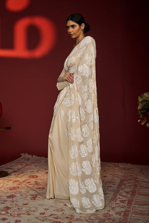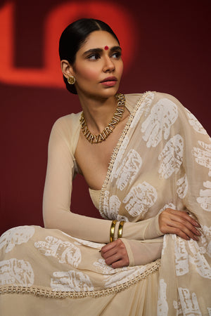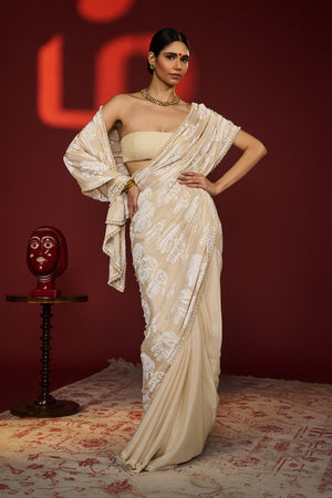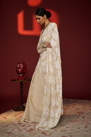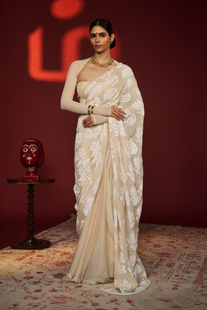 Description: The saree is intricately embellished with our khadi print in the palla embellished with beautiful border | The bustier is tone on tone embroidered and comes with a mesh shrug