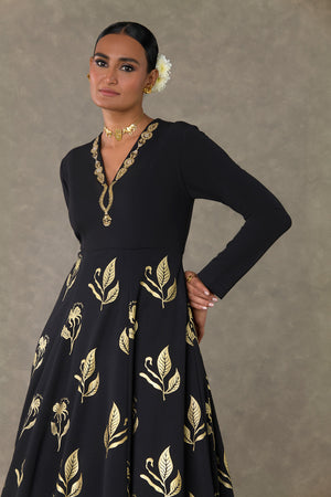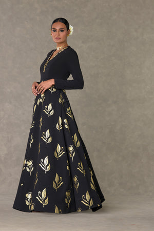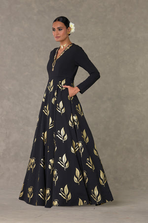 Details: Black Color Gown - All over foil printed Gown | 'V' neckline embeliished with dori and sitara kaam | Full sleeves | Comes with attached Can Can | Center back closure