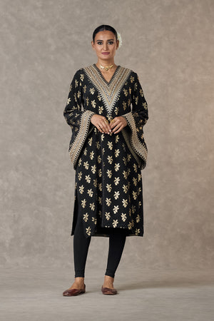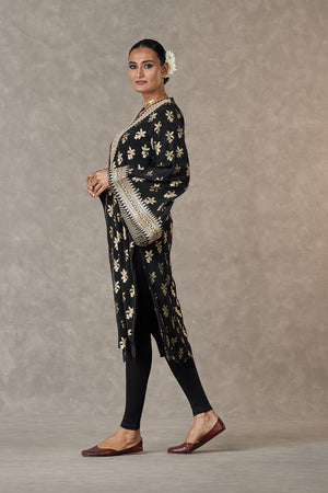Details: Black Cherrybloom Kurta - Embellished with embroidered borders | Outfit features bell sleeves and a 'V' neck | The kurta has a beautiful Cherrybloom print and comes with a black legging