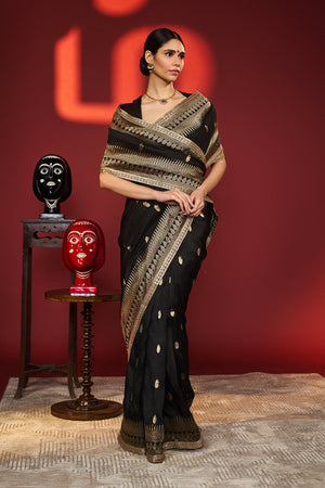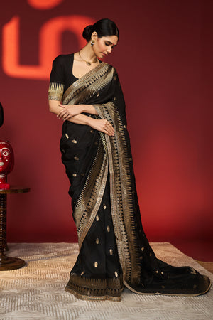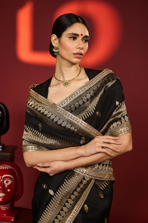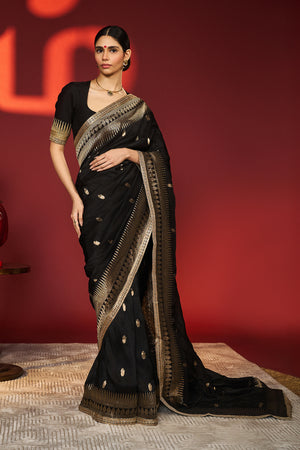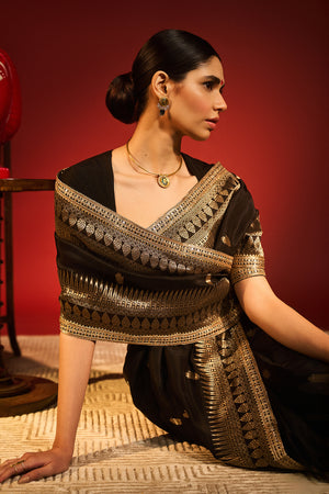 Styling: Pair this Black Gold Saree with gold or antique jewellery, bangles and mojris, add a potli bag in a coordinating color to compliment the look