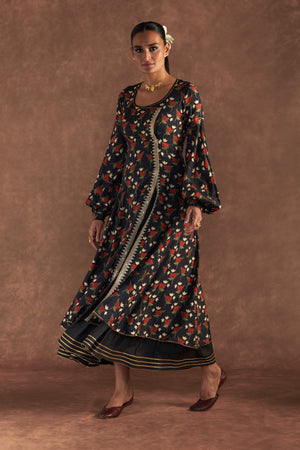 Details: Black Irisbud Kurta Dress - Digital printed kurta dress | Layered hemline | Embellished with border and edged with kinari | Balloon sleeves