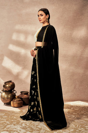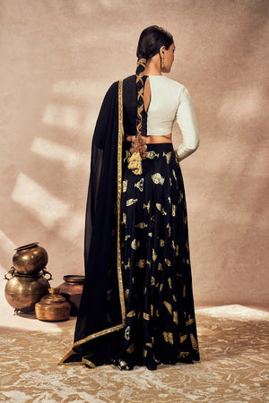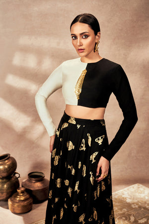 Details: Blouse- Beautiful fitted blouse with half and half colour block | Adorned with gold dori and sequin center embroidery motif | Center back opening Skirt- All over foil printed skirt | Side seam opening