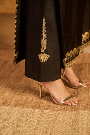 Details: Kurta- Straight kurta with a beautiful gold embroidery motif at the front | Round neckline | Center back closure | Foil-printed borders beautifully applied on the hem and sleeves Pant- Black straight pants with Cheery foil print placement | Side seam closure