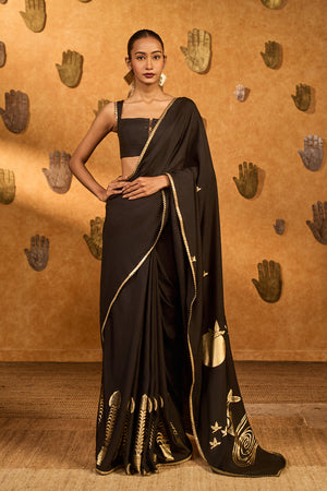 Details: Saree - The saree features a beautiful placement foil print on the pallu, along with complementing foil prints on the pleats. Blouse- The blouse features an embellished border used as a strap, adding a stylish and elegant touch.