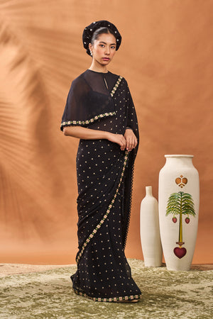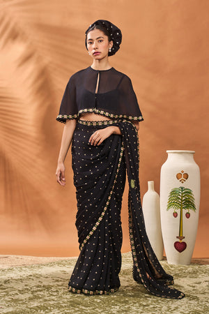 Details: Saree- Beautiful all over printed saree with black striped all fours | Adorned with scalloped crochet border Blouse piece- Blouse with all over digital print | See-through blouse piece with vertical crochet detailing Cape- black front open cape with a scalloped crochet border on the hem