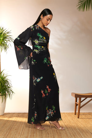 Details: Black Tropicool One Shoulder Dress - One shoulder maxi dress | Bell sleeve | Draped body | Side slit | Side seam zipper closure