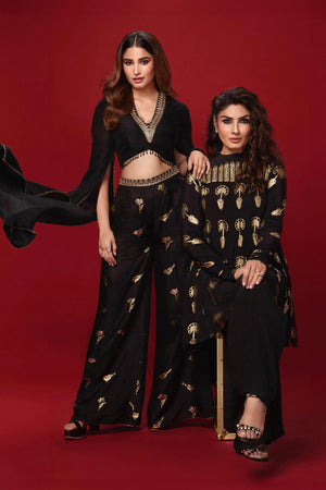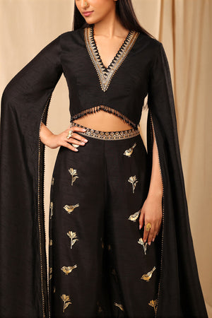 Details: Black Vintage Fiona Palazzo Set - This Black Raw Silk Fusion Set comes with a V neck Bustier which is embellished with embroidered scallop border and edged with crystal danglers, the back is adorned with aari embroidery, it also has winged sleeve which is edged with kinari to dazzel at special occasion! Palazzo has beautiful Vintage Fiona foil print which is edged with kinari and has pockets.