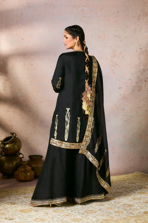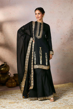 Details: Kurta - Beautiful foil printed kurta | Mandarin collar | Front Placket opening | Full sleeves | Embellished with embroidered borders Sharara- Semi-Fitted Sharara embellished with embroidered borders | Side seam opening Dupatta- Printed organza dupatta | Embellished with embroidered border and edged with kinari