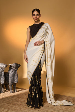 Details: Saree – an elegant half-and-half foil printed saree | pallu adorned with palm tree foil prints | pleats featuring an all-over tribal pillar foil print | embellished with a handmade sequin lace for a touch of shimmer Blouse – black Viscose Crepe blouse piece
