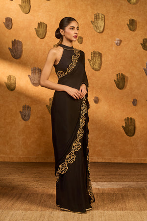 Details: Saree - A saree crafted with golden gota embroidery, intricately embellished with delicate appliqué detailing. Blouse Piece - The blouse piece has a beautifully central embroidered motif.