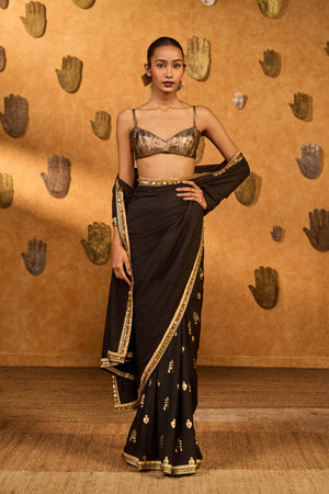 "Details: This black saree in opulent raw silk features a bold half-and-half layout, accentuated with intricate ombré foil print motifs in gold. The pallu is crafted in crushed silk with statement regal patterns, adding rich texture and drama to the silhouette. It is paired with a striking gota blouse, designed in a structured, sleeveless cut with a sweetheart neckline—perfect for festive evenings with a modern edge.