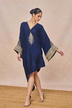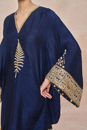 Details: Blue Embroidered Kaftan - With Slip | Embroidered kaftan with embellished sleeve & neckline | Asymmetrical hem