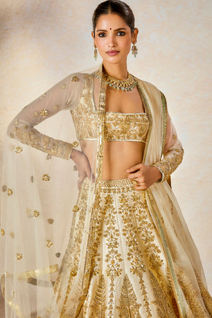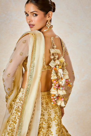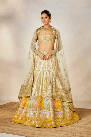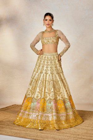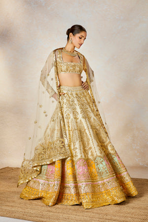 Details: Lehenga- Lehenga embellished with 'Gul Jharoka' and 'Amaltas' motif in gold dori, sitara, badla and dabka kaam | Applique colour blocked embroidery | 18 Kalis | Contrast colour blocked border with embroidery and edged with kinari |Pocket detail | Side zip closure | Comes with a separate Can Can skirt Blouse- Square neckline | Full sleeves | Net Sleeves |Center back opening with tie-up tassel detail | Printed lining | Open back Dupatta- Net body dupatta embroidered with 'Gul Jharoka' and lampi gota border edging Optional Dupatta- Organza dupatta embroidered with 'Amaltas' motifs | Embellished with contrast embroidered borders and edged with jhallar|Printed backing |Tassel detail