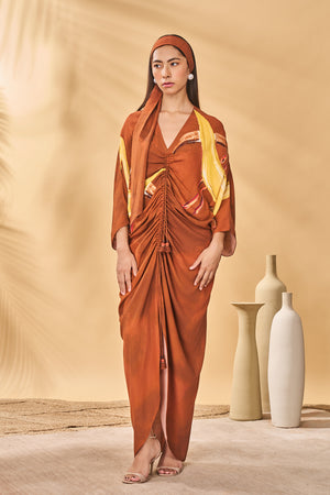 Details: V-neck | Front ruching with adjustable tie-up | Tulip hem | Draped body | Brown Feathered placement on body
