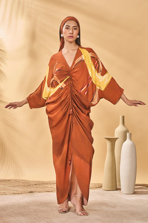 Brown Feathered Cinched Kaftan