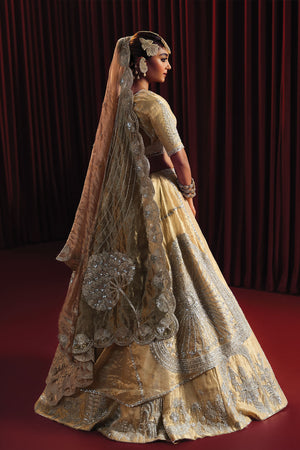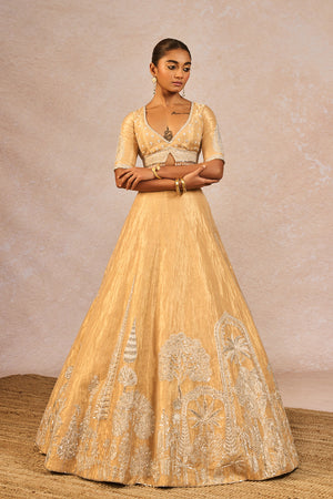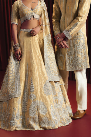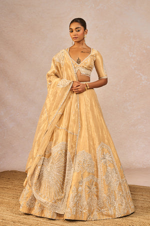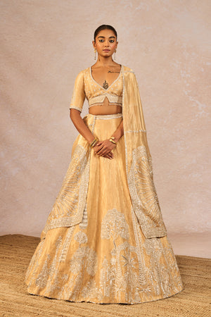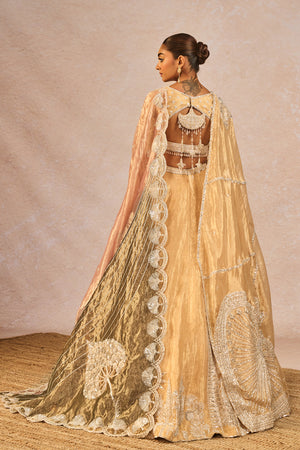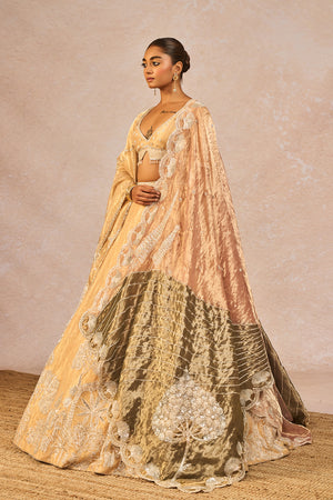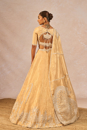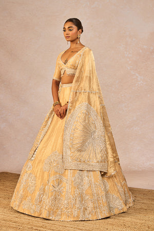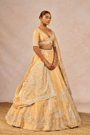 Description: The Chandni Lehenga comes alive on a luminous gold tissue base, featuring our signature 'Gul Jharokha' motif alongside intricate elements like paan phool, vrksh sitara, and pankh bagh. These are delicately hand-embroidered in zardozi with silver dori, sitara, and moti work, inspired by mixed metals. It is paired with an ornate gold tissue blouse adorned with silver booti embroidery and finished with crystal tassels at the hem. Styled with a tissue drape showcasing paan phool cutwork at the pallu ends. An optional contrast dupatta with scalloped edges, patchwork colourblocking, and signature motifs completes the look. celebrations.