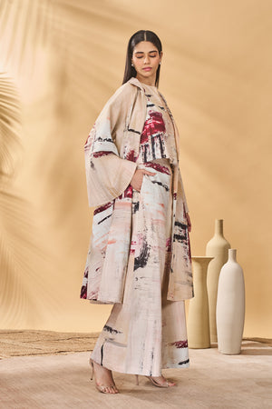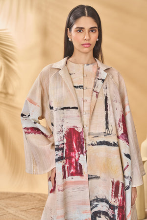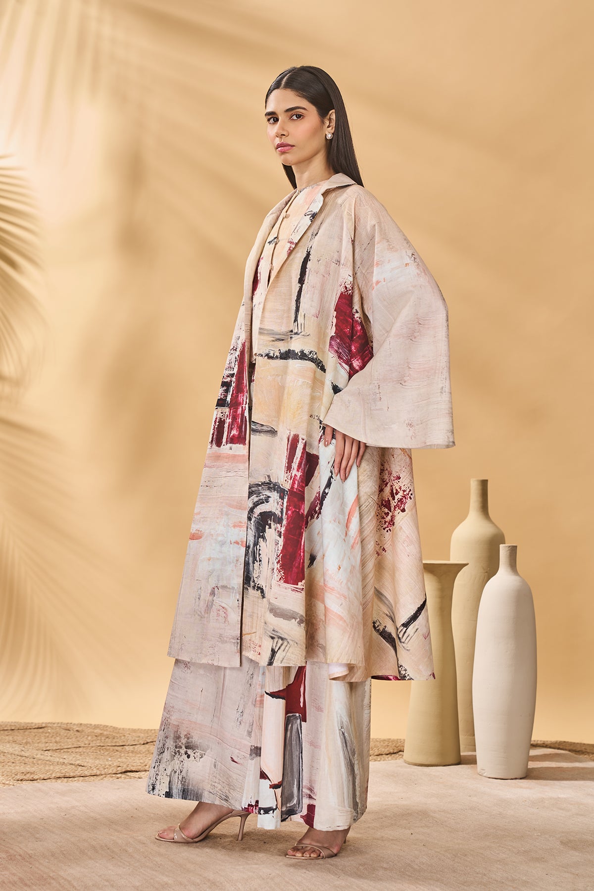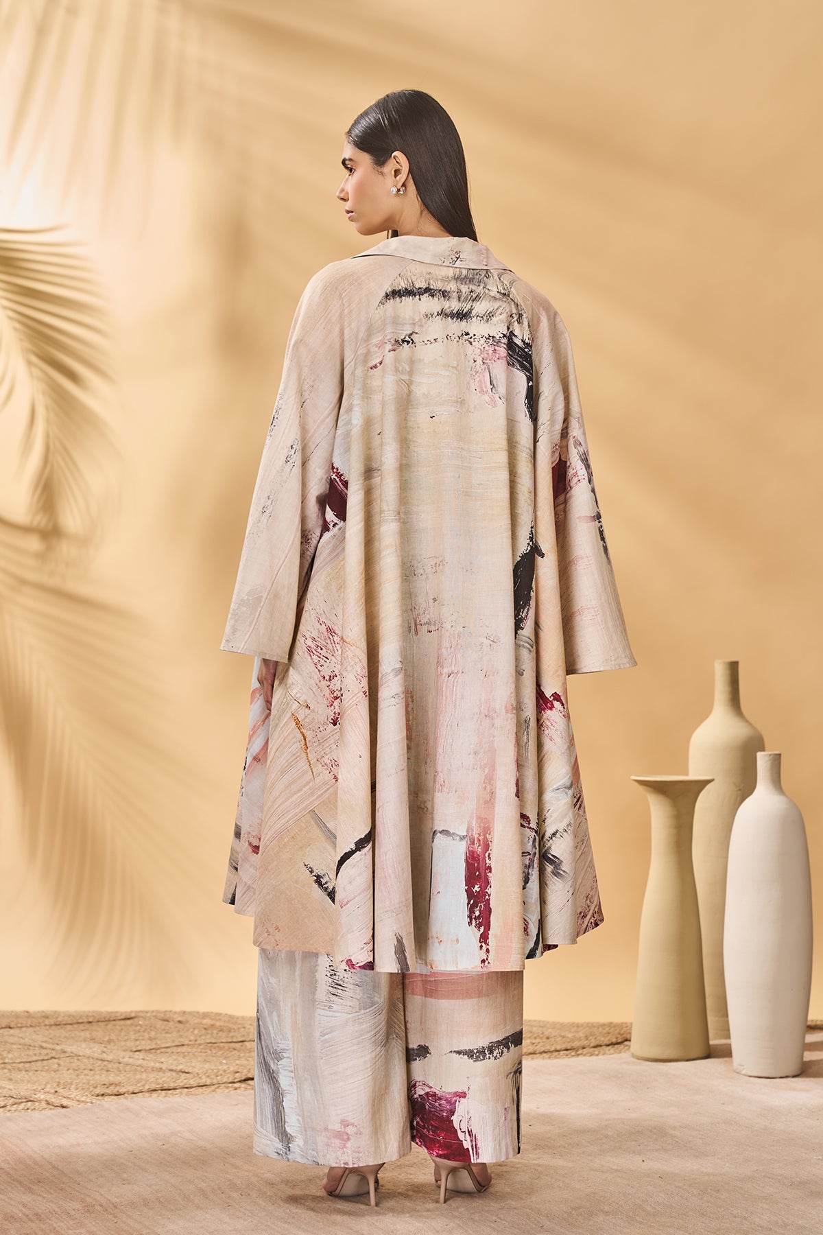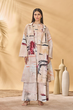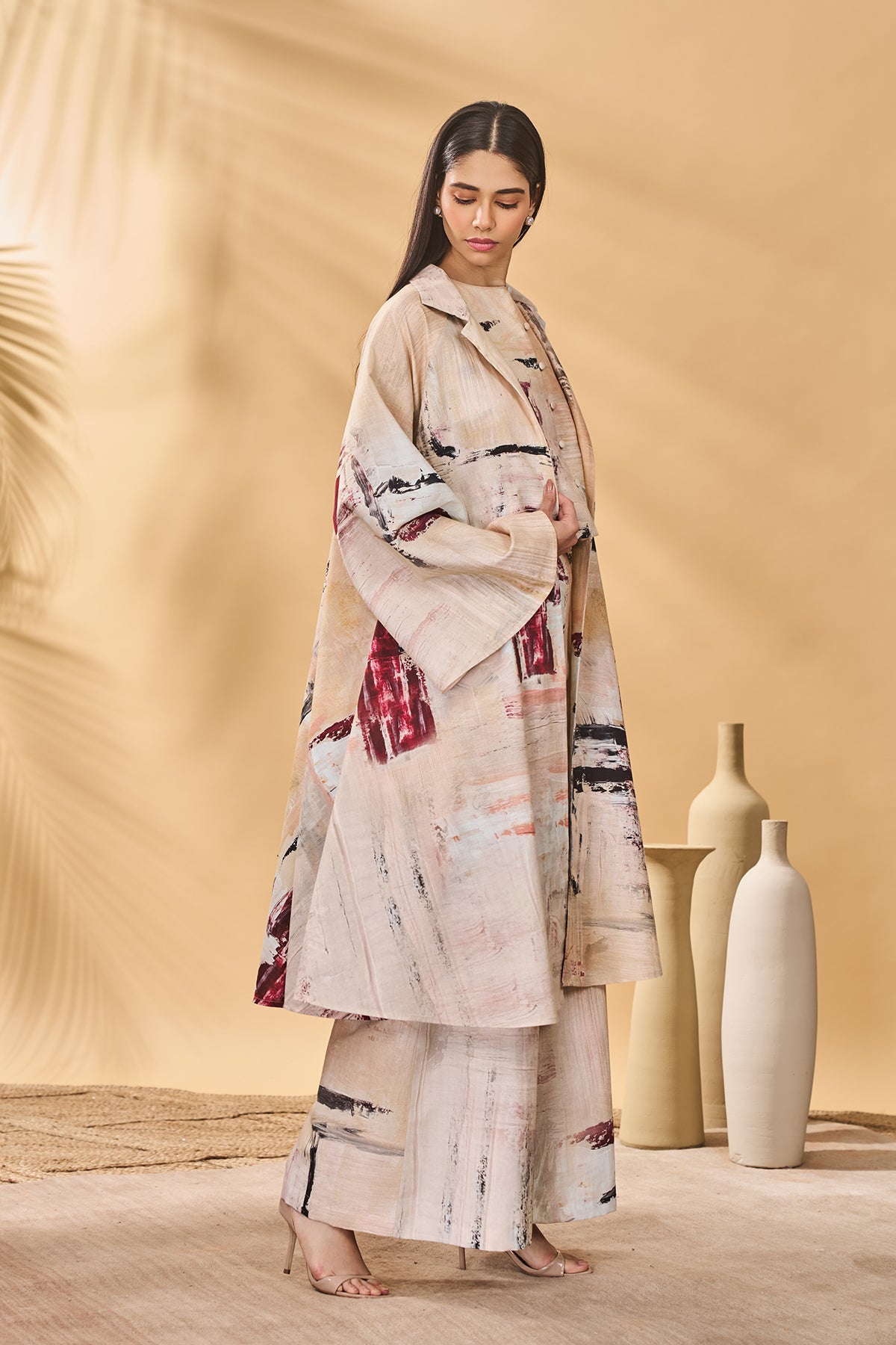 Details: Waistcoat- Round neck | Front button closure | Straight fit Pants- Straight bottom pants | Side pocket |Elastic at the back | Side zipper closure Jacket- Trench style jacket | Bell sleeves | notch collar | Swing jacket