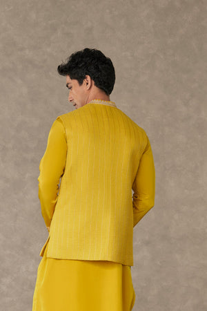 Details: Corn Yellow Tissue Bandi - Adorned with tone on tone dhagai kaam | Center front opening | Mandarin collar | Concealed placket | Welt