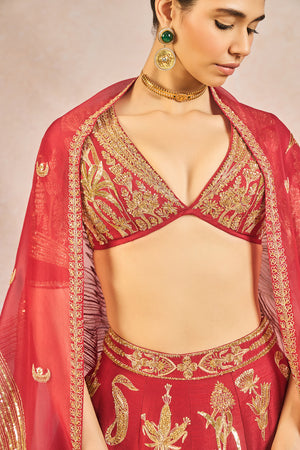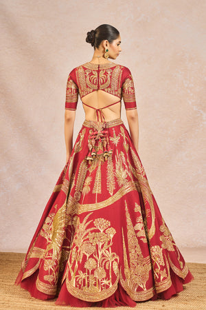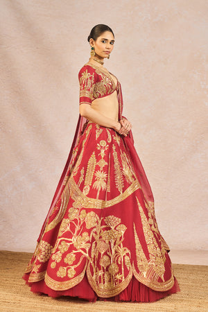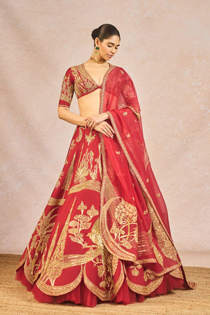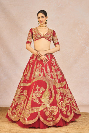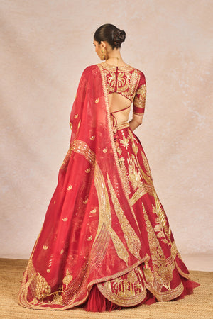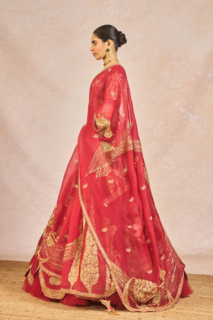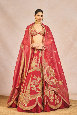 Details: The 'Dhadkan' Lehenga Set- Lehenga intricately embroidered in asymmetrical enlarged 'Chaand' story | Chaand shaped hem | 12 Kalis | Side Seam zipper closure | Side pockets | Comes with a separate Can Can skirt. Blouse- Deep V-neckline | Centre back closure with tie-up detail. Dupatta - Red organza dupatta with enlarged 'Son Chidiya' motif placement | Dainty 'Chaand' motif buttis all-over.