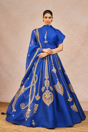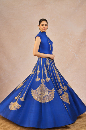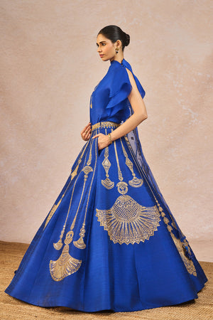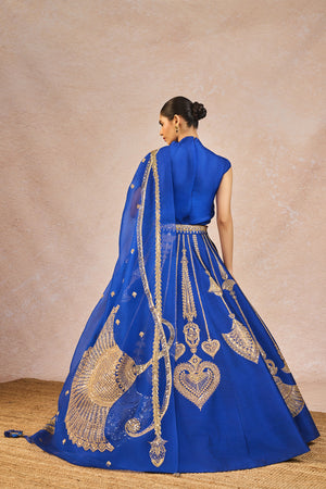 Description: This 'Dil Jaanta Hai' Lehenga is a stunning expression of detailed craftsmanship, featuring intricate 'Paankh Bagh' motifs highlighted with moti work, sitara kaam, and fine cutdana embroidery in rich gold. The lehenga is embellished with playful and symbolic elements like fan motifs, arranged in striking vertical placements. Paired with a gold-embroidered linear motif with a plain bustier layered under the sheer organza high-neck top that adds fluidity and structure, the ensemble is both bold and refined. A matching blue organza dupatta, showcases a statement gold-embroidered 'Paankh Bagh' motif that cascades dramatically across its length, tying the entire look together with grandeur and visual intrigue.
