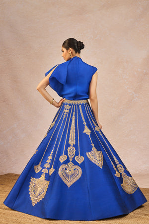 Details: The 'Dil Jaanta Hai' Lehenga Set- Lehenga intricately embroidered with multiple 'Pankha' motif in a linear pattern | 12 Kalis | Side Seam zipper closure | Side pockets | Comes with a separate Can Can skirt. Tube- Adjustable Stap | Centre back closure. Blouse- Build-up neckline | Asymmetrical body | Embroidered motif placement | Draped Cascade on one side | Button closure on shoulder | Centre back zipper closure. Dupatta- Royal Blue organza dupatta with enlarged 'Pankha' motif placement | Delicate butti embroidered all over.