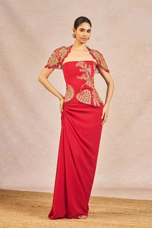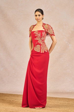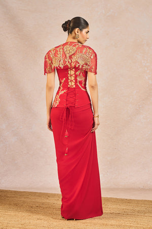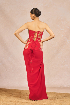 Description: ‘DIL KE PASS’ fusion set is a captivating Indian fusion ensemble that blends traditional opulence with modern allure. This set features a structured corset, intricately adorned with gold embroidery inspired by the elegant 'paankh bagh' and 'paan phool motif. The corset's design is elevated with exquisite gold work, crafted using sitara, katdana and moti embroidery, with a cutwork hemline creating a shimmering masterpiece that radiates sophistication. Paired with the corset is a draped skirt that adds a graceful flow to the ensemble, perfectly balancing the structured top. Completing the look is a delicate shrug, adorned with two charming motifs embroidered with cutwork, adding a playful yet refined touch with crystal tassels. The corset set is ideal for festive occasions, weddings, or any event where you want to make a striking statement with a blend of tradition and contemporary style.
