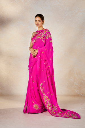 Description:Our iconic hot pink comes to life in a whimsical expression in The Dilli 6 saree. Inspired by the bustling cultural streets of purani Dilli, where expression and heritage is brewed, this saree is a manifestation of those very streets. Brimming with the Anar bagh jaal through the pallu in starry gold, and scattered with colorful threadwork and beadwork .