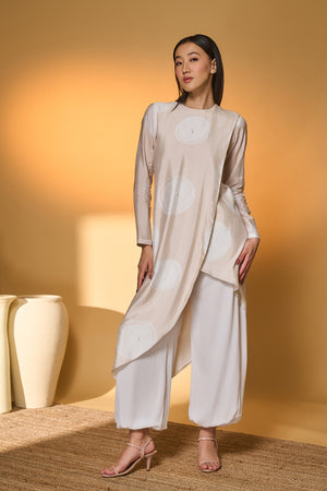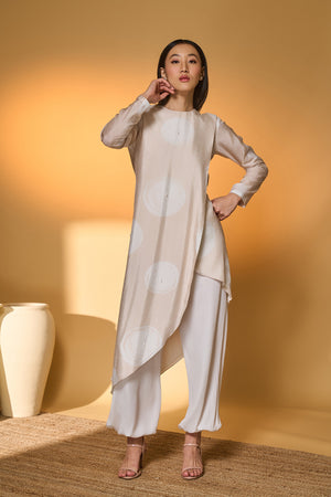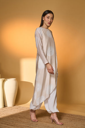 Details: Kurta- Asymmetrical overlap detail | Pearl Tassel detail all-over the body | All-over print | Full Sleeves Pants- Balloon Silhouette | Cinched hem with elastic detail