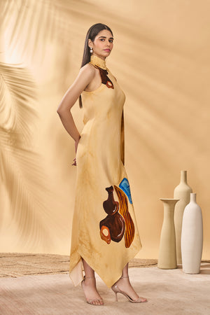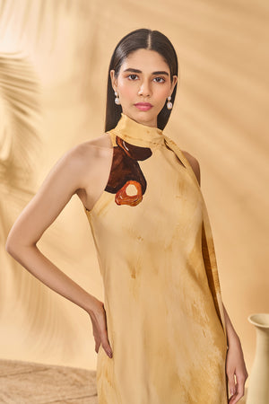 Details: Halter neck | Sash attached | Asymmetrical hem | Earthen Echoes placement on hem