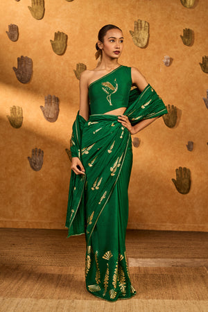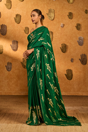Details: The saree is a half-and-half design, featuring a beautiful placement foil print on the pleats and an all-over foil print on the crushed pallu. Blouse Piece - The blouse piece features beautiful embroidery at the center, adding an elegant touch to the design.