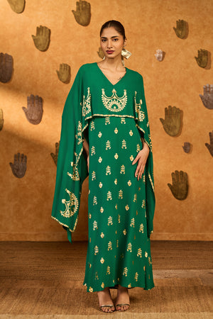 Details: A graceful green kaftan, featuring a lunar crown print on the top half and a locket loop foil print on the bottom half. Finished with a foil-printed border all over, the piece blends striking motifs with refined detailing.