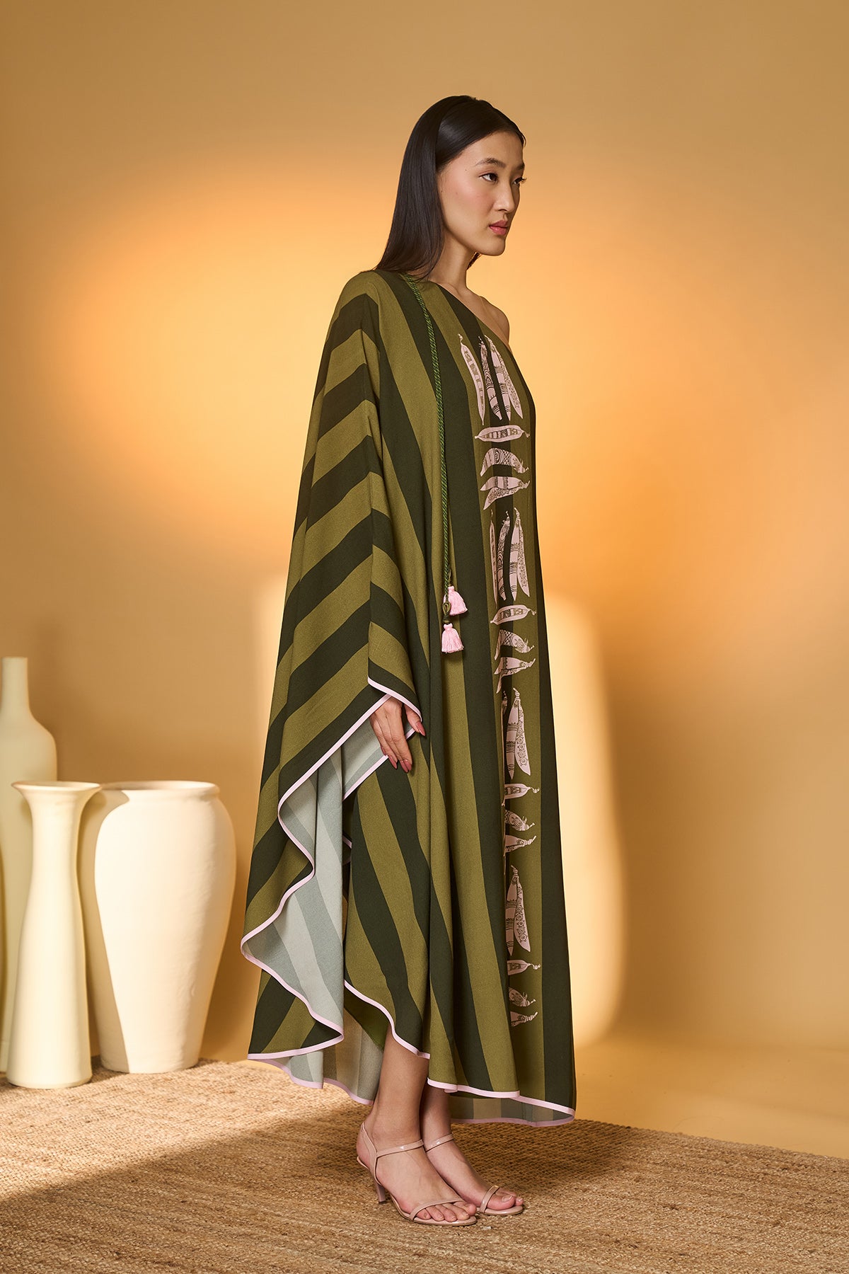 Details: One Shoulder Kaftan- 'Totem Pod' placement on front | Contrast piping detail | Adorned with contrast tassels with crystal droplets