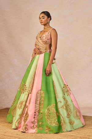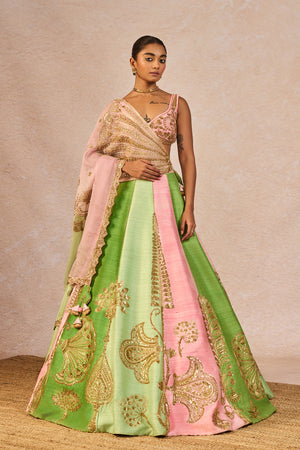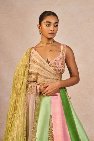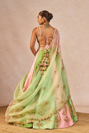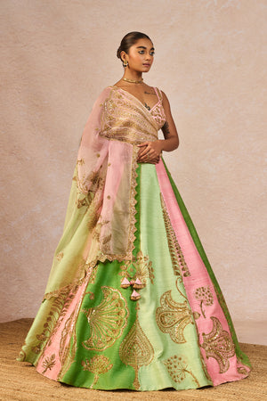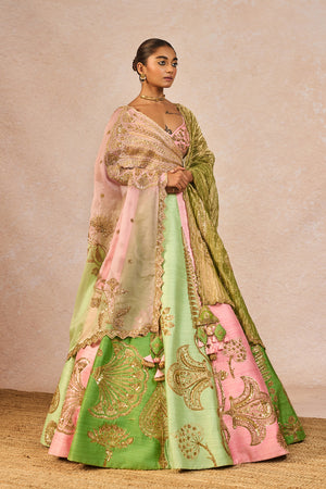 Details: The 'Gulposh' Lehenga Set- Lehenga intricately embroidered with 'Pankha' motifs in a linear pattern | 12 Kalis | Side Seam zipper closure | Side pockets | Comes with a separate Can Can skirt. Blouse- Strapless | Corset Body with cut-out detail | Open back with tie-up detail | Centre back closure. Dupatta 1 - Light green organza with Light pink Patchwork Dupatta with enlarged 'Pankha' motif placement on the corners | Delicate butti embroidered all over. Dupatta 2- Green Crushed Tissue Dupatta with linear 'pankha' motifs embroidery | Delicate butti embroidery all over.