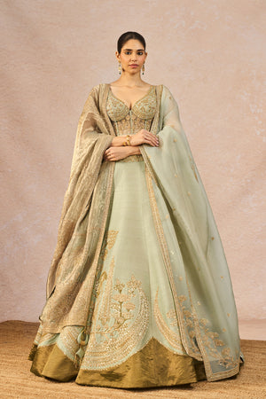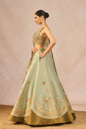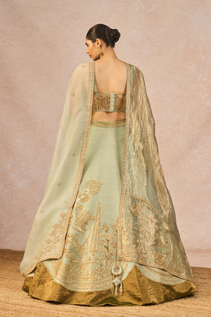 Details: The 'Ikrar Hua' Lehenga Set- Lehenga intricately embroidered with enlarged 'Chaand' motif | Contrast Patchwork | 6 Kalis | Side Seam zipper closure | Side pockets | Comes with a separate Can Can skirt, Blouse- Plunging V-neckline | Corset body | Centre back closure. Dupatta 1 - Sheer Mint Green organza dupatta with circular embroiderey all-over. Dupatta 2- Tissue dupatta with delicate embroidery all-over | Scallop Hem.
