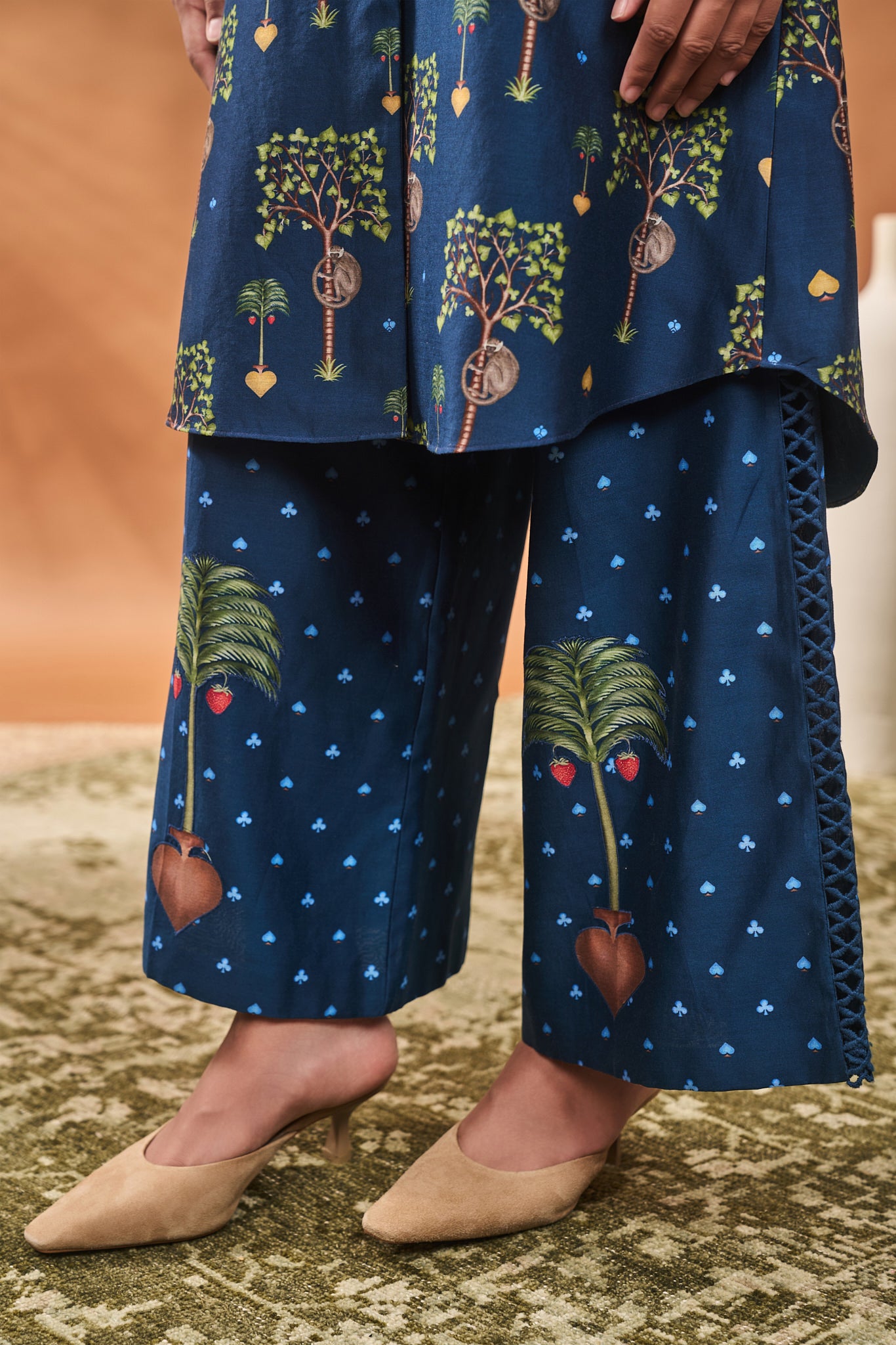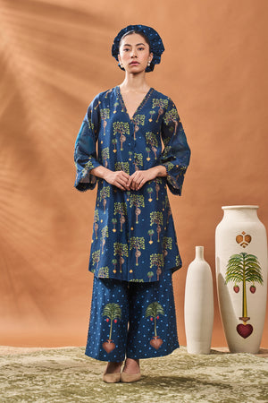 Details: Tunic- All over printed tunic |A-line| 'V' neckline and sleeves hem adorned with hand embroidery Pant- Green straight pants | Side seam closure