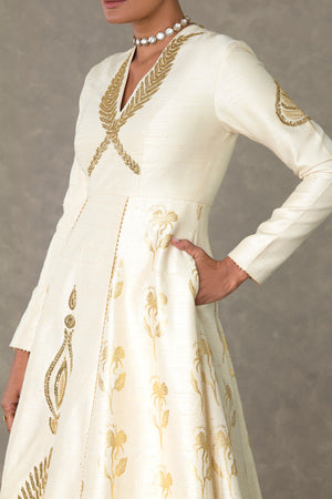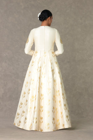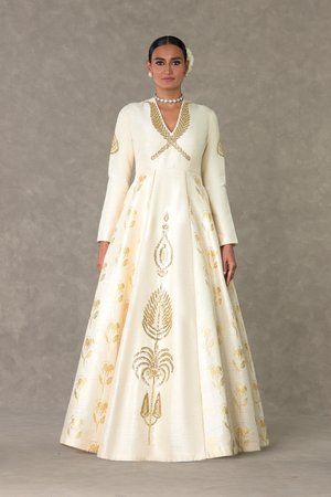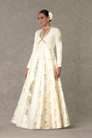 Details: Ivory Dresses for Wedding - All over foil printed Gown edged with kinari at the hem| 'V' neckline embellished with dori and sitara kaam | Full sleeves embellished with Dil- Phool motif in dori and sitara kaam | Comes with attached Can Can | Center back closure